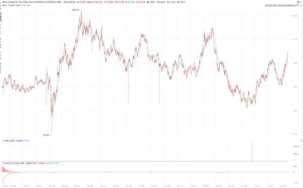 对比GDX指数,或者你用Barrick,Newmont这些公司也一样,你会发现,它们都在技术关键点位,但相对来说,斜率比黄金要大一点。