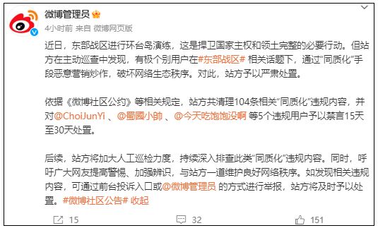 依据《微博社区公约》等相关规定,站方共清理104条相关“同质化”违规内容,并对@ChoiJunYi 、@蜀國小帥 、@今天吃饱饱没啊 等5个违规用户予以禁言15天至30天处置。