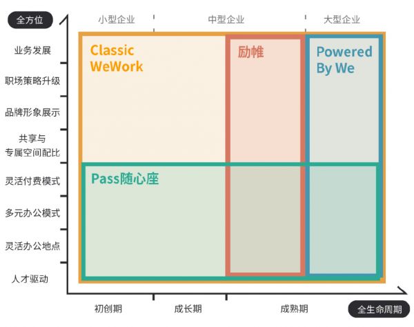 首先,针对不同规模企业的多样化需求,WeWork共享联合办公空间提供全方位、覆盖企业全生命周期的空间产品及服务。其中,经典办公产品一人起订、按月付费,拎包入驻,一价全包,为从自由职业者到成熟型企业等各类会员提供服务;励帷是专为注重独立品牌形象的中大型企业提供服务的高品质商务空间,风格更加稳重精致;Pass随心座是为商旅人士和都市精英提供的随行办公产品,为希望尝试混合性办公企业创造可能性,可以通过一张随心座卡触达全国12个城市和地区的开放式工位;Powered by We为大型企业提供专属上门定制服务。