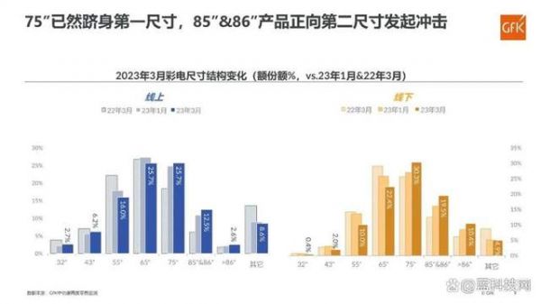从零售额份额数据上来看,截至2023年3月,国内75吋电视产品已成为线上及线下市场的第一尺寸;另外从零售量数据上来说,线下75吋产品占比已经爬升到了第二名,而且和第一名65吋的差距正不断拉近。
