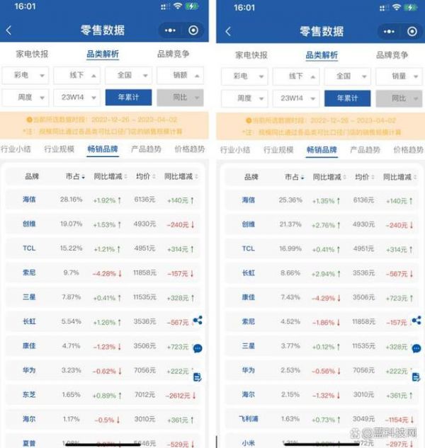 根据奥维云网的行业统计数据显示,在2022年12月26日到4月6日期间,在线上渠道,海信销量市占率第二名、销售额市占率第一名。