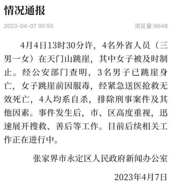 2023年4月4日4名青年在湖南张家界天门山景区跳崖,消息曝出,全网轰动。4月7日,张家界市永定区人民政府新闻办公室发布通告:4月4日13时30分许,4名外省人员(三男一女)在天门山跳崖,其中女子被及时制止。经公安部门查明,3名男子已跳崖身亡,女子跳崖前因服毒,经紧急送医抢救无效死亡,4人均系自杀,排除刑事案件及其他因素。