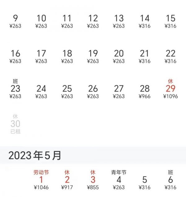 刘老板所经营的6套房屋在五一期间价格也涨了不少。以普通一室大床房为例,平常价格保持在263元/晚,而4月28日~5月3日的价格平均则在1000元/晚左右,为平常价格的3.8倍。