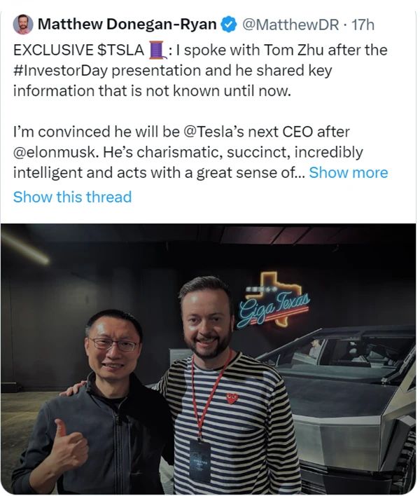 Wedbush的分析师Daniel Ives称,特斯拉的投资者日是马斯克和特斯拉社区的展示活动,他认为,朱晓彤“显然在特斯拉在中国和全球的成功中发挥了重要作用”。基金经理Ross Gerber在推特上表示:看来我们知道谁是生产的二把手了。