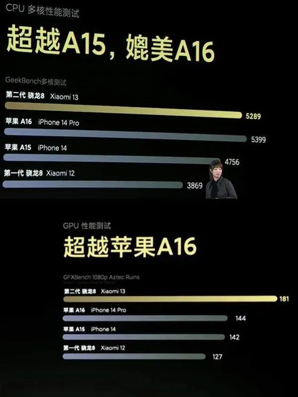 据说早在小米13发布会上的时候,根据发布会介绍,骁龙8 Gen2 CPU就已经媲美苹果A16,GPU更是实现了大幅度超越,被冠以“弯道超车”的称号。