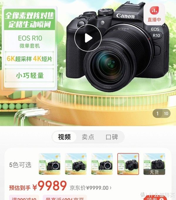 于是,我开始考虑佳能R10相机,裸机售价为5399元,支持4k30超采样,画质也不错。这款相机几乎是我的最佳选择。但是,它最大的缺点是没什么镜头,如果想要扩展镜头的话,要么购买全画幅镜头,要么使用转接环。使用全画幅镜头的话,只有RF版的小痰盂比较便宜。而使用转接环的话,需要忍受老镜头的体积,同时变焦声音会影响音频的录制。
