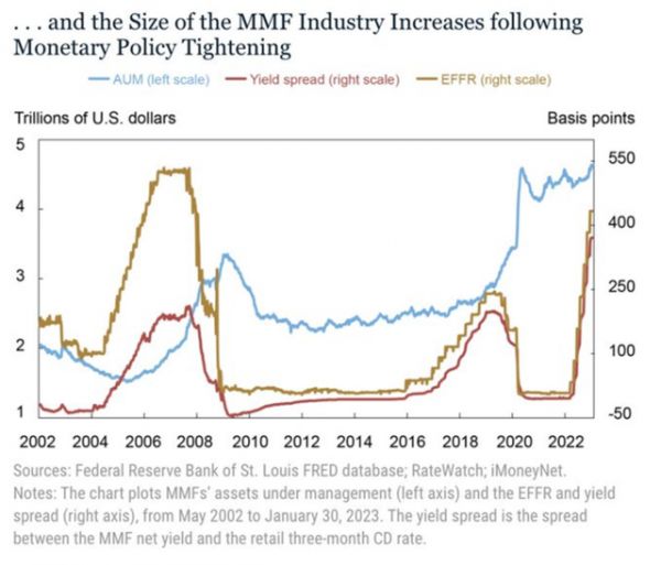 纽约联储4日报告认为,MMF(货币市场基金)行业确实在2004年~2008年、2015年~2018年和2022年之后的货币政策紧缩周期之后实现了扩张。而且货币政策收紧实际上也可能会导致MMF行业将来进一步扩张。