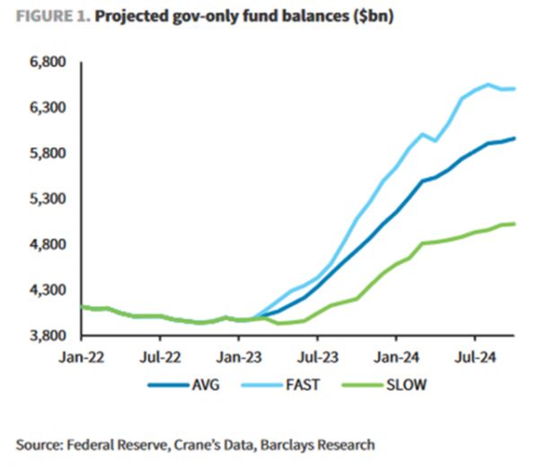 根据过去的紧缩周期,对于储蓄搬家的规模(通常发生在加息后大约一年左右,具体时间和速度取决于美联储加息的力度),巴克莱分析了三种情况下政府类货币基金(如下图,投资政府债务,货基中占比83%)余额的未来增长情况。