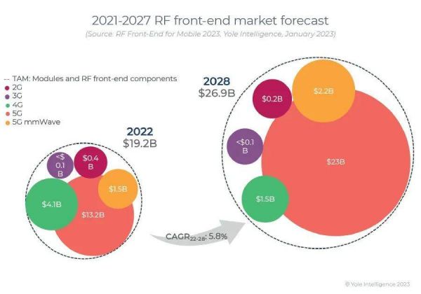 根据Yole的数据,2021年射频前端的市场为190亿美元以上,2022年由于手机市场的下滑,射频前端市场规模与2021年的市场相差无几。而接下来,由于智能手机的温和增长以及5G普及的潜力有限,预计到2028年射频前端的市场年复合增长率约为5.8%,将达到269亿美元。不由发问,射频芯片,不香了吗?