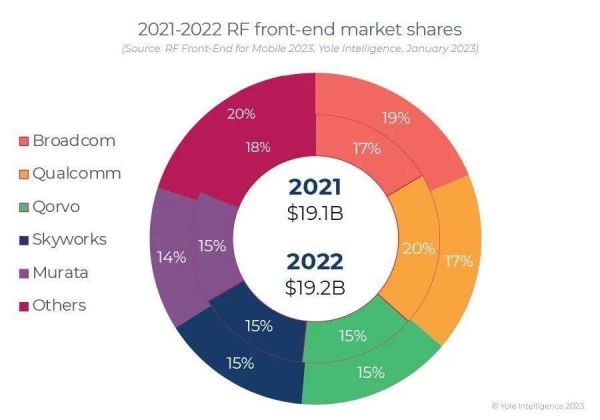 射频前端行业是我国集成电路行业中对外依存度较高的细分领域之一,特别是在 5G、高集成度射频前端模组等前沿市场,据Yole的数据,2022年全球射频前端市场由Broadcom(19%)、Qualcomm(17%)、Qorvo(15%)、Skyworks(15%)和村田(14%)等美系和日系厂商占据主导地位,这些射频巨头通过不断地收购整合,不断补强射频前端技术能力。这五大射频前端厂商合计占据市场约 80%的份额,也占据我国大部分的市场份额。