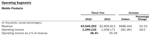 2022年Qorvo营收46.5亿美元,同比增长15.7%。收入增长主要是由于对Qorvo的5G移动解决方案以及电源管理、汽车和宽带产品的需求增加。其中移动产品仍然占据Qorvo 76%的营收来源,而且2022年移动产品的营收同比增长了24.1%。Qorvo在财报中提到,移动产品的高增长主要是最大客户5G内容增加所推动的。