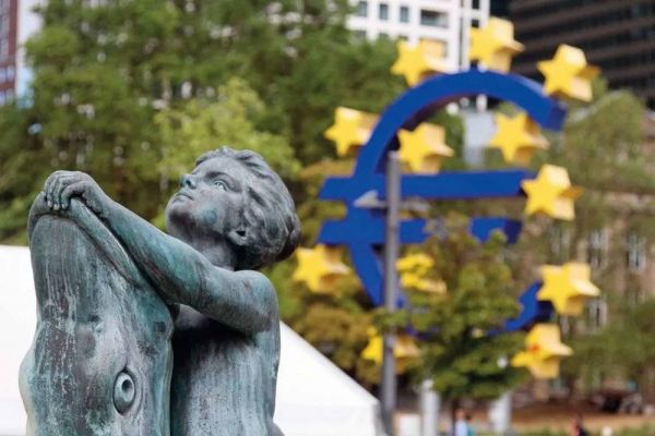 这是 2022 年 9 月 8 日在德国法兰克福拍摄的欧元雕塑和一座喷泉雕塑 单玮怡摄/本刊