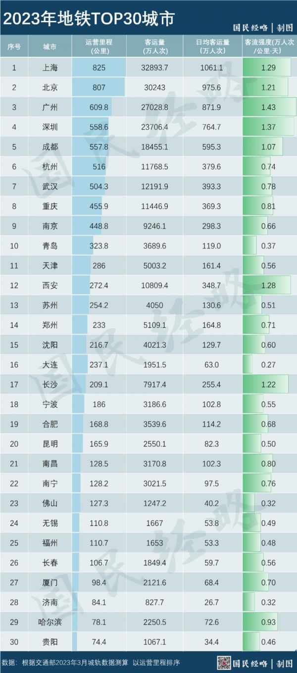 根据交通部提供的最新数据,广州、深圳月平均客流强度分别高达1.43、1.37万人次/公里/天,力压京沪,超过了许多二线省会城市的2倍以上。