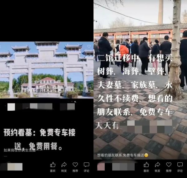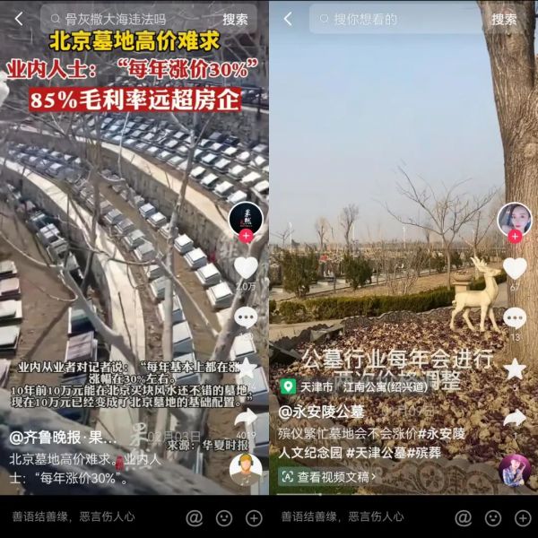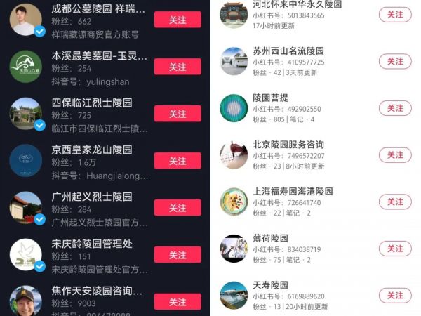 社交平台上,出现了不少陵园官方账号从20世纪80年代到现在,销售墓地的人已经从墓地工作人员延伸到了殡葬服务业人员,专业的墓地销售中介也开始出现。随着互联网发展,传统的线下销售模式也慢慢转移到了线上,不少社交平台和短视频平台都能看到墓地相关的信息,墓地的推广载体越来越多元。