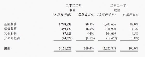 福寿园财报在“殡葬第一股”福寿园的2022年财报中,墓园服务收益达到了17.49亿元,在总收益中占比80.5%,经营利润率达到了56.4%,而在墓园服务中,墓穴销售服务的收益就占据了90.8%。墓地销售,目前还是墓园的主要收入来源。