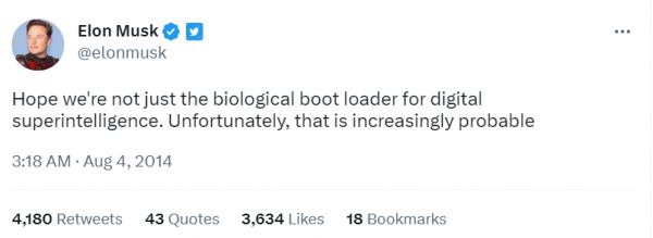 这不禁让我联想到马斯克曾在2014年做出的预言。他认为从“物种进化的尺度”来看,以人类为代表的“碳基生命”可能只是以“AI”为代表的“硅基生命”的启动脚本。
