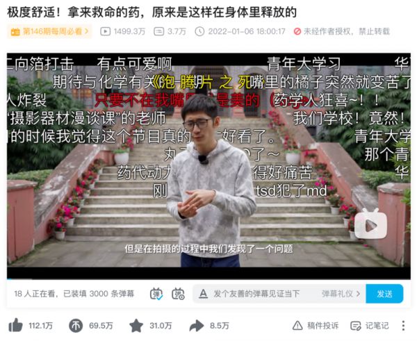 获奖视频《极度舒适!拿来救命的药,原来是这样在身体里释放的》,动用了高速摄像机,去拍四川大学华西药学院邓黎教授的药剂学课题组,把一颗药丸在人体内工作的过程,做得堪比一场魔术揭秘,无怪乎能有1500万播放。
