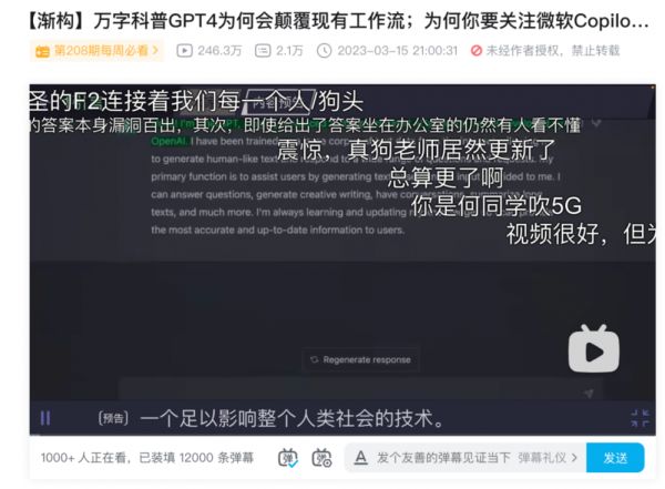 B站上一个长达50分钟的《【渐构】万字科普GPT4为何会颠覆现有工作流;为何你要关注微软Copilot、文心一言等大模型》视频,播放量超过了200万。直到上传一个月后的今天,依然能保持时刻处在1000+人同时观看的状态。