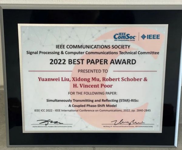 2021年,相关论文以《STAR:同时透射和反射的360度智能表面》(STAR:Simultaneous Transmission and Reflection for 360° Coverage by Intelligent Surfaces)为题发表在 IEEE Wireless Communications 上[3]。其发表在 IEEE ICC 2022 通信领域旗舰会议上的论文“Simultaneously Transmitting and Reflecting (STAR)-RISs:A Coupled Phase-Shift Model”获得了 2022 年 IEEE 通信信号处理与计算技术委员会的最佳论文奖。
