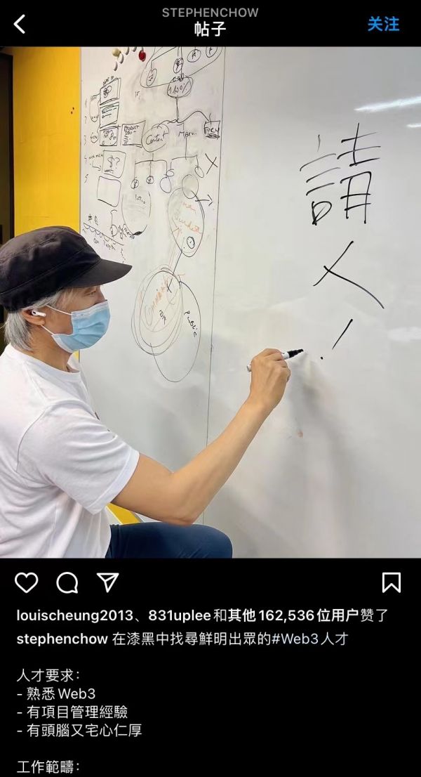 去年十月,在香港发布竞争国际虚拟资产中心蓝图愿景的两天后,周星驰在Instagram中发布了一条招募令,广纳Web 3人才,这位风格鲜明的导演也正式入局Web 3。不过,除了后续对招聘工作的汇报外,周星驰的Web 3项目还没有透露出任何讯息。