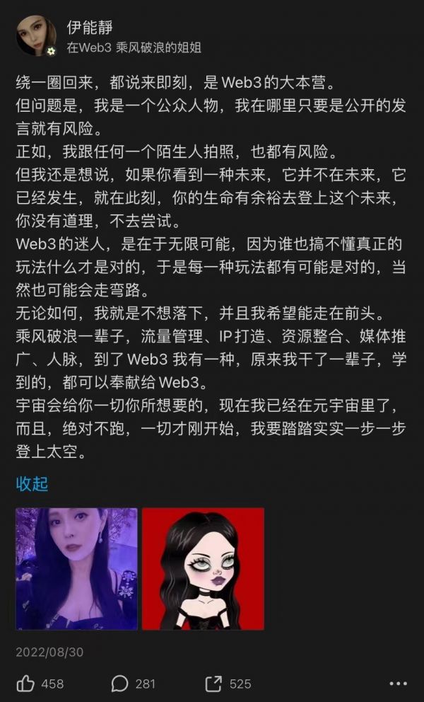 同样低调撤离的还有在Web 3火爆时期高调入局的伊能静。