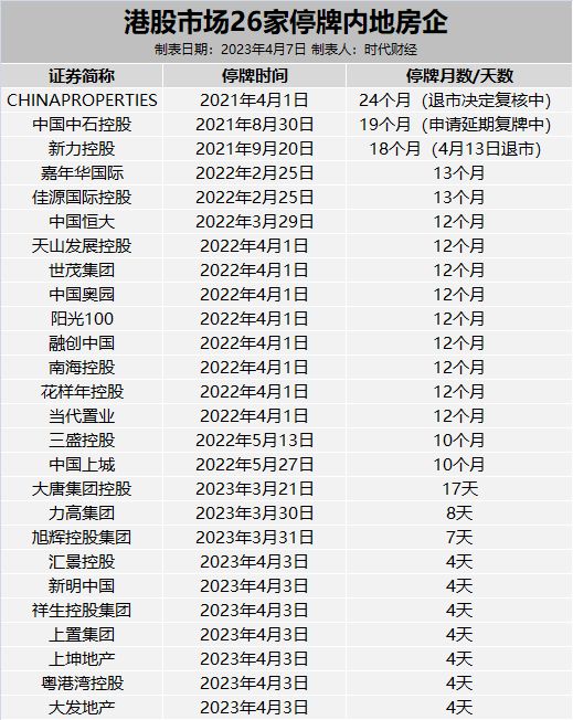 截至4月7日,除了新力控股,仍有25家主营业务包括住宅开发的内地房企处于停牌状态, 这些房企大多数因无法按时披露业绩而停牌,包括融创中国、中国恒大、中国奥园、阳光100、花样年控股、旭辉控股集团、祥生控股集团和上坤地产等。