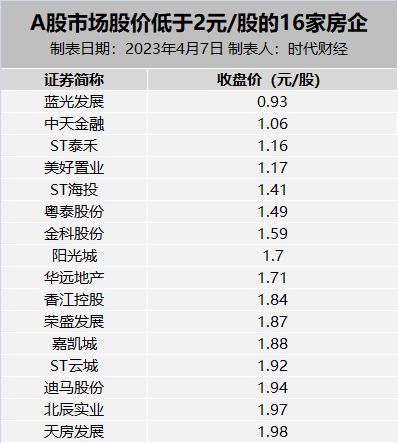 截至4月7日,A股市场虽仅有蓝光发展一家房企股价低于1元/股且净资产为负,但另有15家房企的收盘价已跌破2元/股,包括中天金融、ST泰禾、美好置业、ST海投、粤泰股份、金科股份、阳光城、华远地产、香江控股、荣盛发展、嘉凯城、ST云城、迪马股份、北辰实业、天房发展,大部分房企股价已徘徊在此区间至少一年。