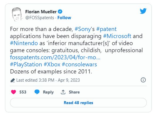 据IT之家了解,这位专利专家名叫弗洛里安・穆勒(Florian Mueller),他在其博客 Foss Patents 上发表了一篇文章,对索尼进行了批评。他引用了 GameRant 的一篇文章,该文章报道了索尼最近公布了一项通用控制器的专利申请,索尼在专利中将非 PlayStation 的产品称为“低劣”产品。穆勒表示,这不仅是“愚蠢”的,而且也不是第一次这样做。他说,索尼从 2011 年起就开始了这种“传统”。