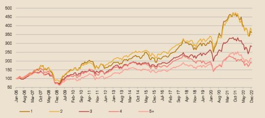 首先,在整个2022年期间,债券收益率呈现上升趋势,甚至出现了一轮债券收益率飙升,“质量风格”投资(质量风格就是追求确定性、高胜率,长期持有好行业、有护城河、有竞争优势、生意模式好、高ROE、高质量的好公司的一种投资风格)在这一年里表现并不是很理想。而家族企业的投资组合模式恰好符合“质量风格”标签,是一种高现金流的投资回报模式。