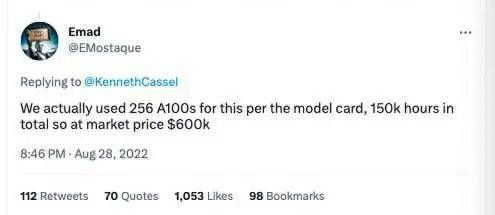 关于训练模型所需的计算资源和成本,Stability AI 的 CEO Emad Mostaque 曾在 Twitter 上回复一位用户时说:“我们实际上为此每个模型卡使用了 256 个 A100,总共 150000 小时,因此市场价格为 600000 美元。”