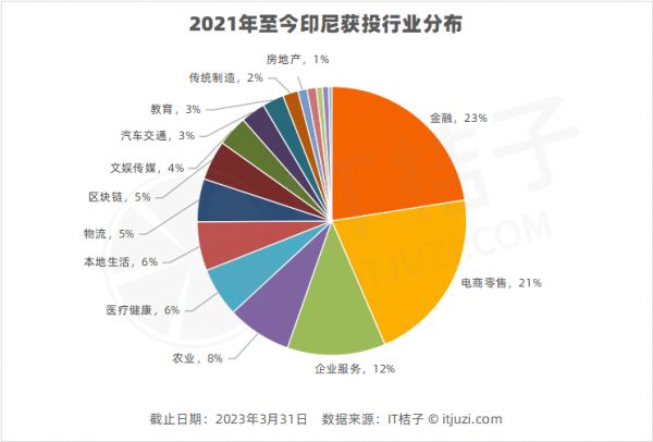 IT 桔子根据公开披露信息,统计 2021 年至今印尼投融资市场获投行业分布,从其热门行业的占比分布中,可窥探一二。