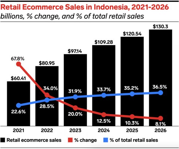 注:印度尼西亚零售电子商务销售占比 图表来源:eMarketer
