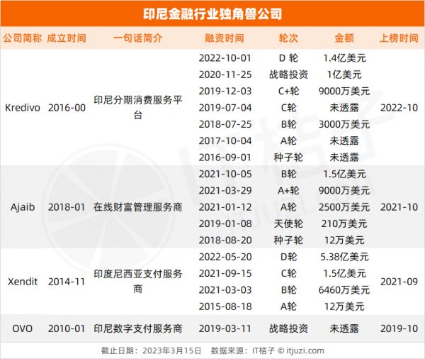 印尼蓬勃发展的金融行业也催生出多家独角兽公司。IT 桔子数据显示,当前印尼共有 4 家独角兽公司,他们均在 2019 年及以后诞生。