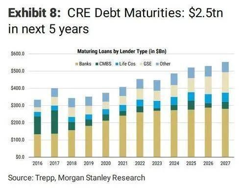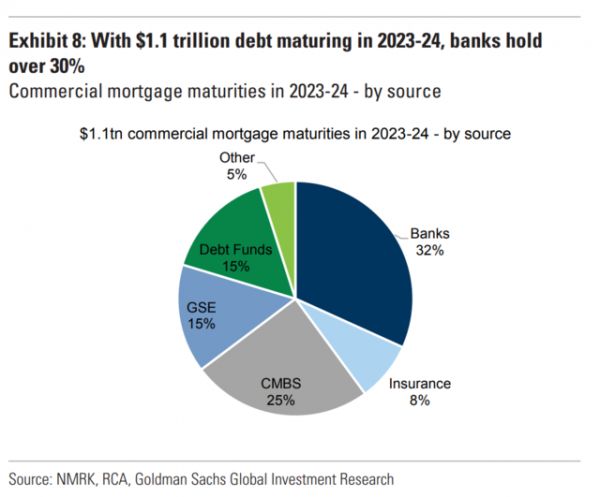 高盛的数据与此类似:在2023~2024年,将有约1.1万亿美元的债务到期,其中32%由银行持有,25%由CMBS持有。