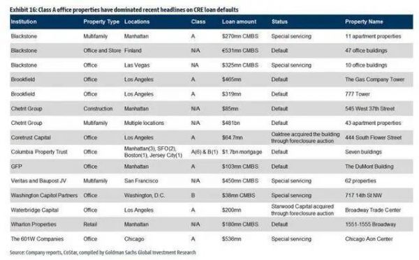 高盛汇总了近期有关房地产违约的报道,结果显示,即便是像黑石这样的巨头在再融资方面也遇到了困难,CRE市场面临的困境可见一斑。