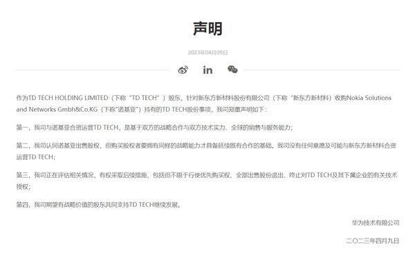 昨晚,华为忽从梦中惊坐起,紧急发表了一则声明:该声明中,华为重点表达了针对新东方新材料股份有限公司(下称“新东方新材料”)收购Nokia Solutions and Networks Gmbh&Co.KG(下称“诺基亚”)持有的TD TECH股份事项,华为发出郑重声明。华为同意诺基亚出售股权,但是收购对象必须具有同样的战略价值。而不是新东方新材料一类的公司,如果是后者,华为选择一拍两散,直接走人。值得一提的是,华为强调——我司正在评估相关情况,有权采取后续措施,包括但不限于行使优先购买权、全部出售股份退出、终止对TD TECH及其下属企业的有关技术授权。