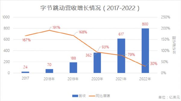 收入方面,2022年字节跳动营收超过800亿美元(约合5500亿元人民币),同比增长30%。自创立起,字节跳动营收一直高速增长。2016年-2018年,字节跳动营收规模分别为人民币60亿元、160亿元、500亿元。