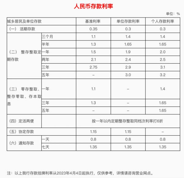 去年4月,建行、工行、中行、农行2年期、3年期普通定期存款利率上限普遍下调10个基点。其中,四家大行2年期定期存款利率上限均下调至2.5%。工行、建行、农行年期定期存款利率上限下调至3.15%;中行起存金额在2万元以上的3年期定期存款利率下调至3.15%,2万元以下下调至3.05%。
