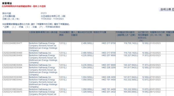 巴菲特继续减持比亚迪H股。4月11日,港交所披露文件,3月31日,伯克希尔.哈撒韦出售248万股比亚迪H股,平均减持价格为每股217.67港元,持股比例下降至10.90%,套现约5.4亿港元。