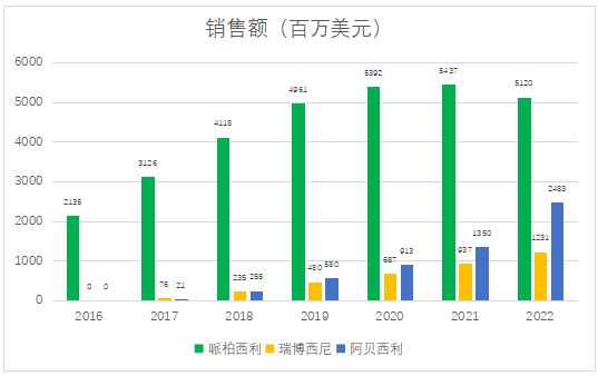 图3. 哌柏西利,瑞博西尼和阿贝西利近几年销售额