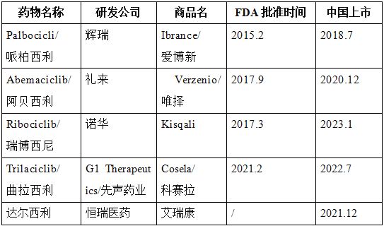 它们的主要获批适应症,包括联合用药用于绝经后 ER+/HER2-晚期乳腺癌的一线治疗,联合用药用于既往内分泌治疗失败的HR+/HER2- 绝经后晚期乳腺癌等,仅有阿贝西利获批HR+/HER2-早期乳腺癌适应症。