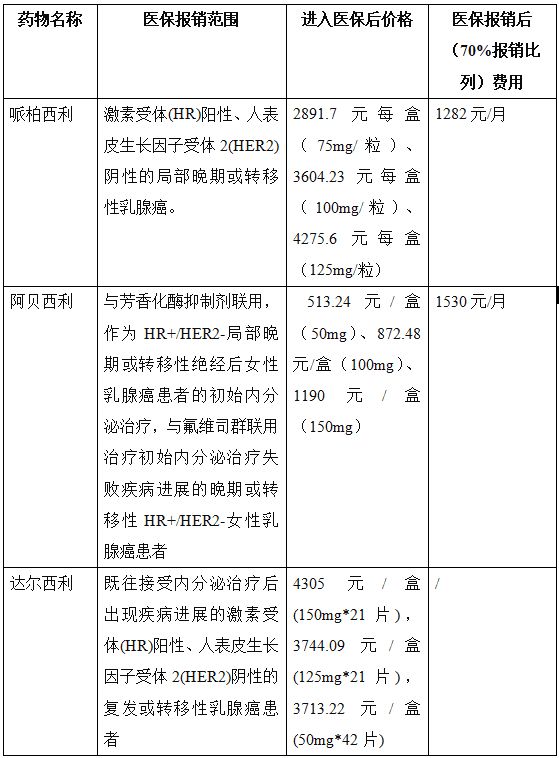 表2. 哌柏西利、阿贝西利和达尔西利医保情况