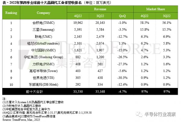 然而,据集邦咨询在三月份今日发布报告称,2022 年第四季度前十大晶圆代工产值经历十四个季度以来首度衰退,环比减少 4.7%,约 335.3 亿美元(,且面对传统淡季及大环境的不确定性,预期 2023 年第一季度跌幅更深。
