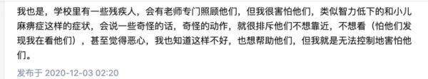 有一位网友表示,他因为小时候在云南看到一群侏儒症患者表演节目,所以在那之后,他对残疾人就开始产生了恐惧心理。走夜路的时候,看到一个残疾人,他宁愿绕一个大弯,都不敢和残疾人一起走小路。