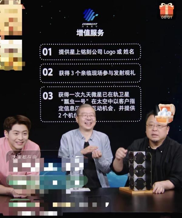 根据罗永浩介绍,该卫星原价200万,发射费用100万,但在昨晚直播间,该卫星售价为原价的五折,加上发射费用,一共200万。此外,还赠送三个附加权益。第一,刻上公司LOGO或者姓名;第二,带三个亲临现场参与发射观礼的名额;第三获得指定信息闪烁的互动机会,并提供两个机位拍摄。