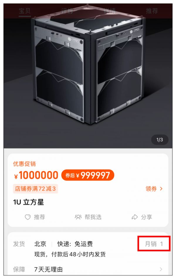 除了直播间销售以外,在“中国航天太空上新”淘宝店内,还有太空班车系列200KG级卫星。这是一系列面向多载荷用户应用的卫星,支持一星多用。其中最贵最低折扣后200万,最贵的3000万,消费者均可直接下单购买。淘宝方面表示,其中一颗卫星已经被东南亚某国的商家拍下。