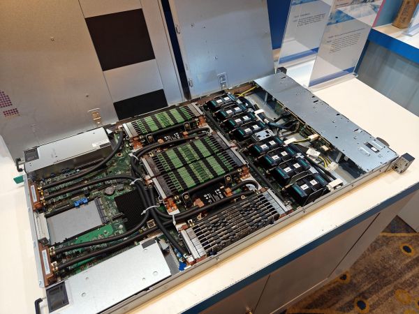 (图片来源:雷科技)在会后的参观环节,我们见到展馆中有相当一部分的英特尔合作厂商都是以散热方案为主要展品,其中又以液冷技术为绝对主流。可以见到,在英特尔推崇的低碳减排方案中,高算力设备的散热优化是技术核心之一,当然展馆内也有其他和主题相关的产品展出,比如提升计算效率的拓展卡,和更符合环保、绿色理念的全新包装设计、材料等。