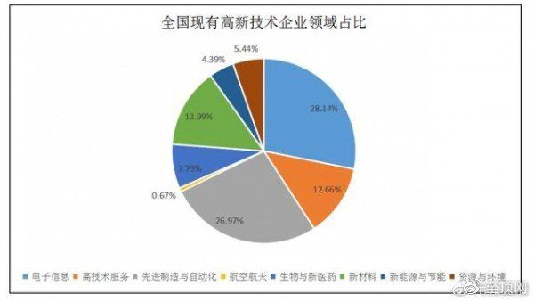 2022年用和企服发布的《全国有效期内“高新技术”企业领域和规模占比现状分析》显示,全国“高新技术”企业领域分布比例依次为:电子信息(28.14%)、先进制造与自动化(26.97%)、新材料(13.99%)、高技术服务(12.66%)、生物与新医药(7.73%)、资源与环境(5.44%)、新能源与节能(4.39%)、航空航天(0.67%)。