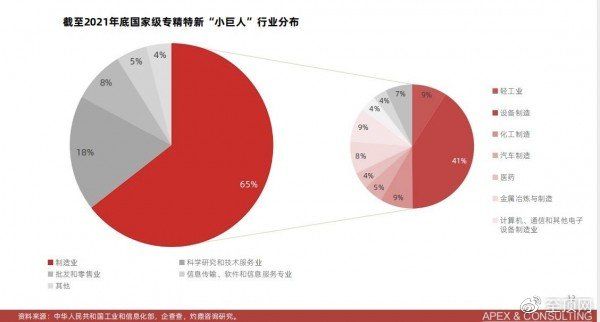对于企业“专精特新”技术的培养分为四个梯度——创新型中小企业—“专精特新”中小企业—专精特新“小巨人”企业—制造业单项冠军企业。其中,专精特新小巨人是专精特新中小企业中的佼佼者,是专注于细分市场、创新能力强、市场占有率高、掌握关键核心技术、质量效益优的排头兵企业。《“专精特新政策”研究报告》指出,截至第三批“专精特新”“小巨人”企业名单公布, 近3200家企业专注于制造业领域。在细分行业中,设备制造俨然成为企业创新发展的主阵地,在制造类企业中占比约41%。