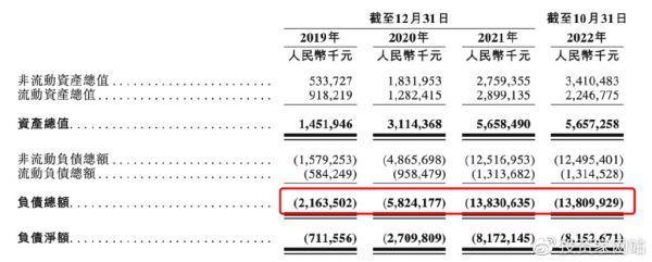 此举背后,或因KK 集团巨额债务压顶。招股书显示,从2019 年至2022 年10 月31 日,KK集团的负债总额由21.64 亿元狂飙至138.1 亿元,不到三年间暴涨6.38 倍。